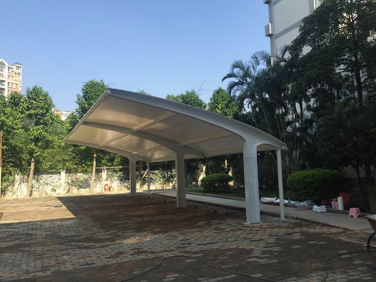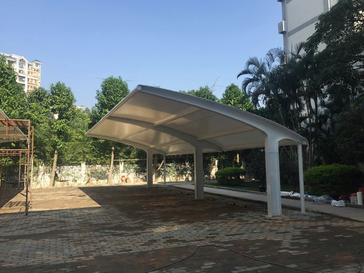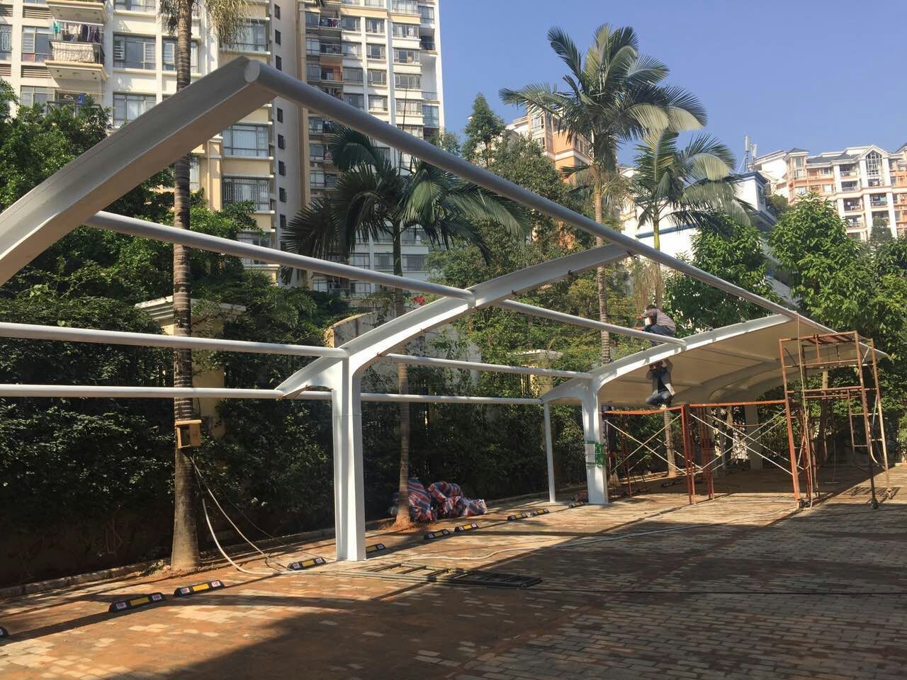 深圳市布吉高級中學(xué)膜結(jié)構(gòu)停車棚施工中,張拉膜車棚,停車棚膜結(jié)構(gòu)。工程:面積280平方米,工程地點(diǎn):布吉高級中學(xué),工期:6天。
