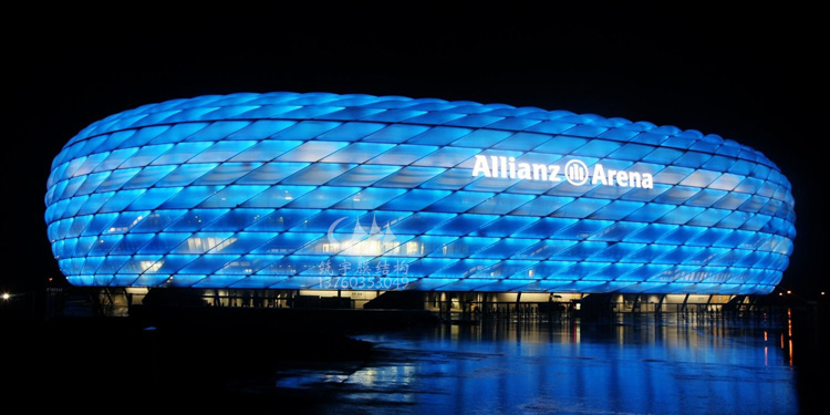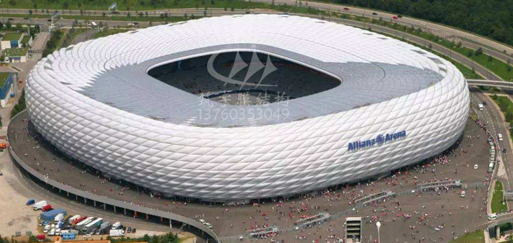 工程名稱:安聯球場 材料說明:膜材料ETFE 結構形式:充氣式 完工時間:2005年 安聯球場由2874個菱形膜結構構成,膜結構具有自清潔,防火、防水以及隔熱性能,每個膜結構都可以在夜間被照成紅藍白三色,分別對應于拜仁、1860以及德國國家隊的隊服顏色。